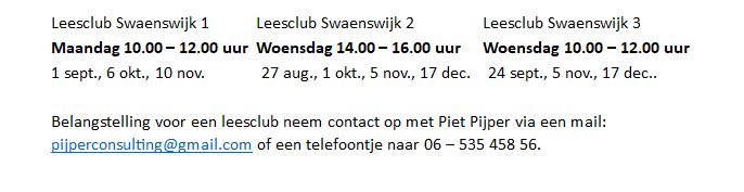 Deze clubs vergaderen eens in de 4-6 weken in Wijkcentrum Swaenswijk om het boek te bespreken